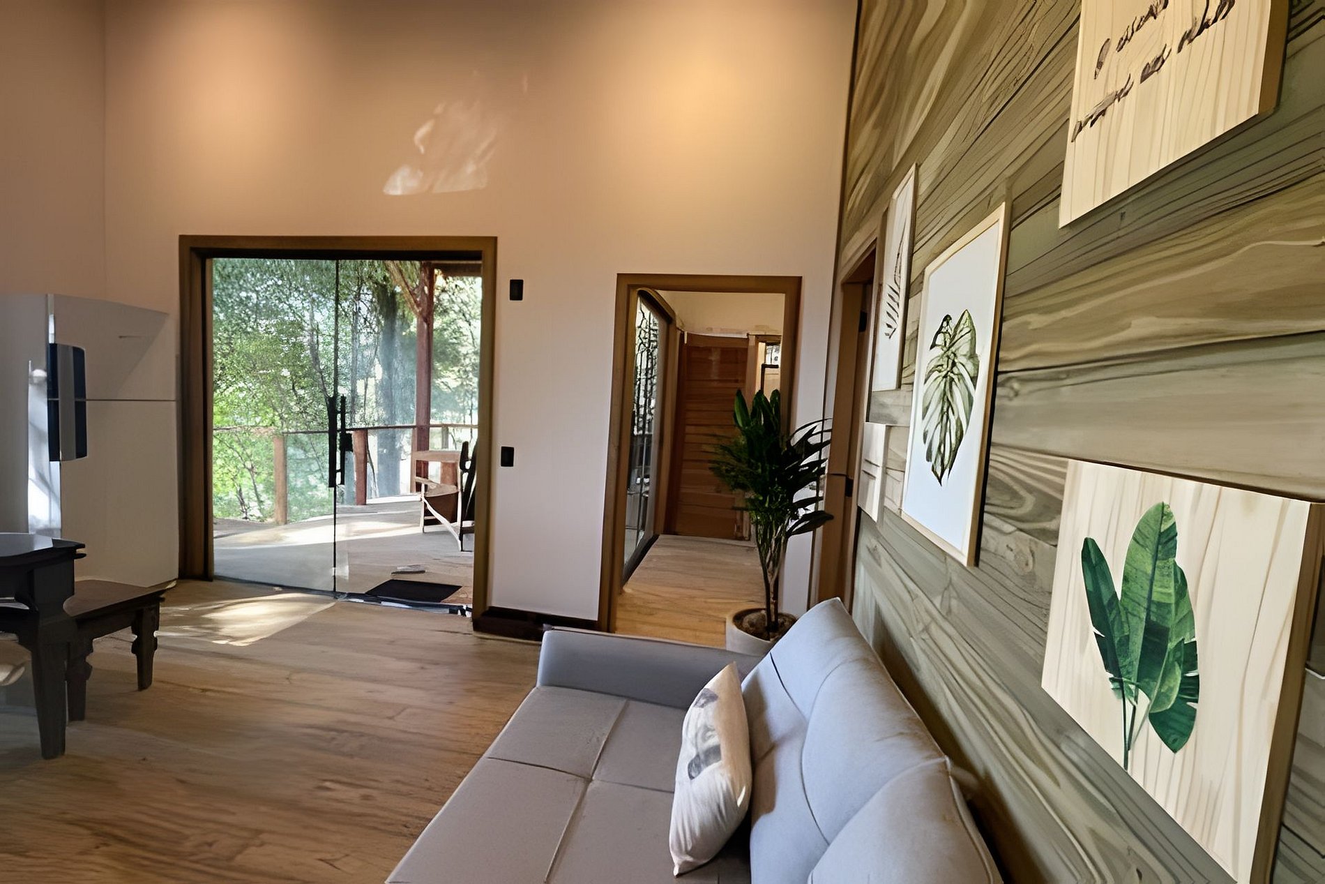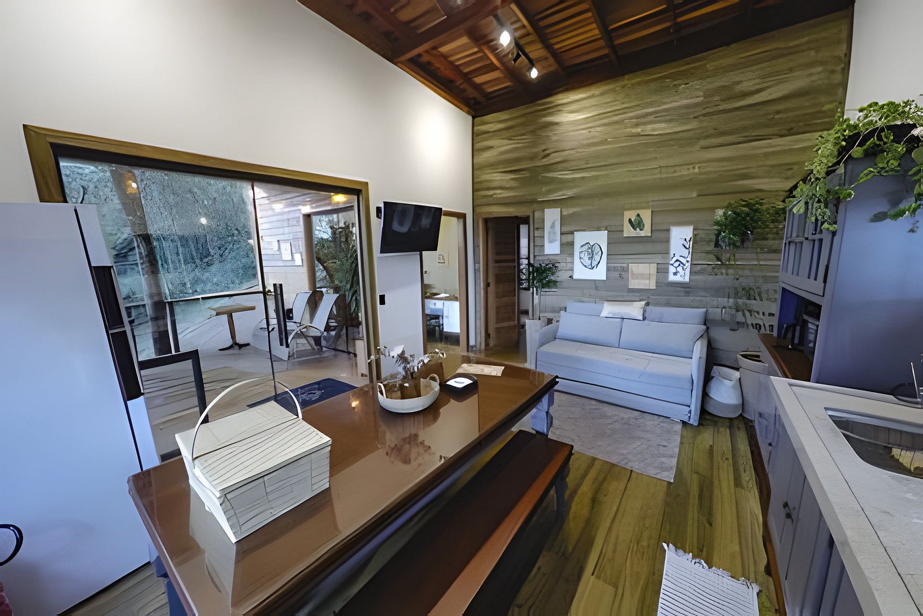 COMODIDADES: - lareira elétrica - fogueira - hidromassagem em espaço integrado na natureza -churrasqueira - cama king Size , lençóis acetinados e toalhas gigantes - Wi fi - Netflix, Disney e Amazon prime ( apesar que a natureza é bem melhor)